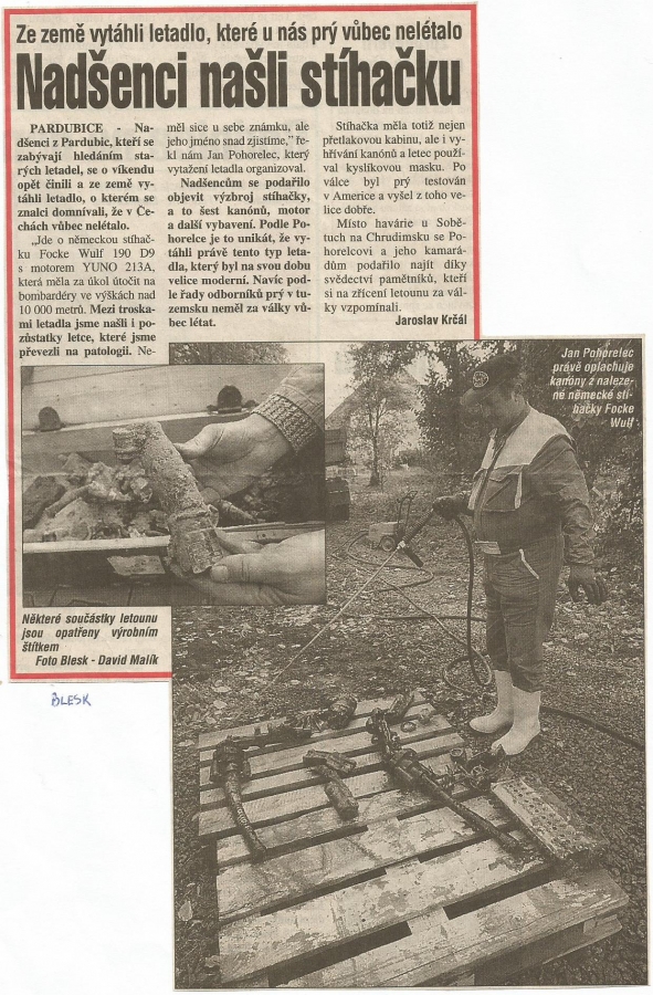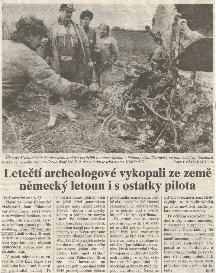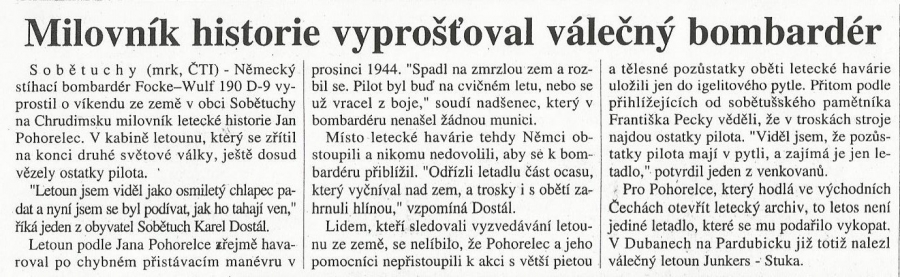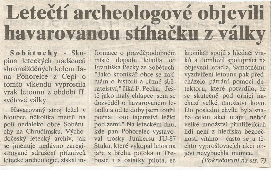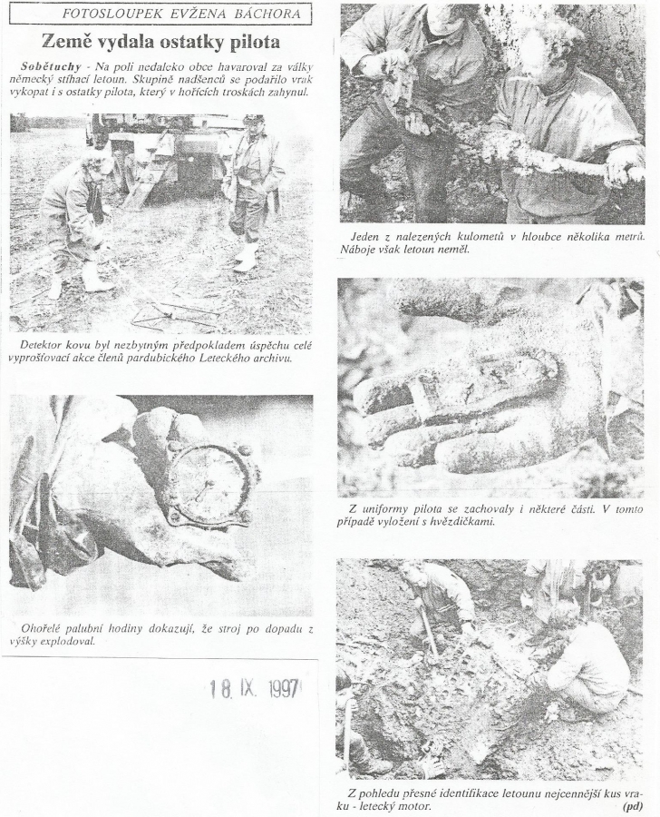 Druhé letadlo které se podařilo zaměřit a vyzvednout byl Německý letoun Messerschmitt Me-109, který havaroval v prosinci roku 1944 u obce Sobětuchy. Nalezen a vyzvednut dne 10. 10. 1997 v obci Sobětuchy okres Chrudim