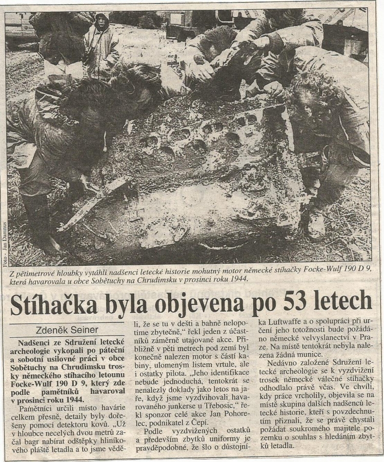 Druhé letadlo které se podařilo zaměřit a vyzvednout byl Německý letoun Messerschmitt Me-109, který havaroval v prosinci roku 1944 u obce Sobětuchy. Nalezen a vyzvednut dne 10. 10. 1997 v obci Sobětuchy okres Chrudim