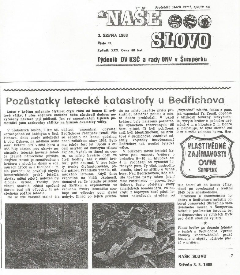 Byli jsme se s pamětníkem podívat na místě kde havaroval v roce 1944 německý letoun. Typ nebyl určen až do doby než jsem našel část zadního střeliště podle kterého jsem určil že jde o letoun Junkers Ju-88 A-?