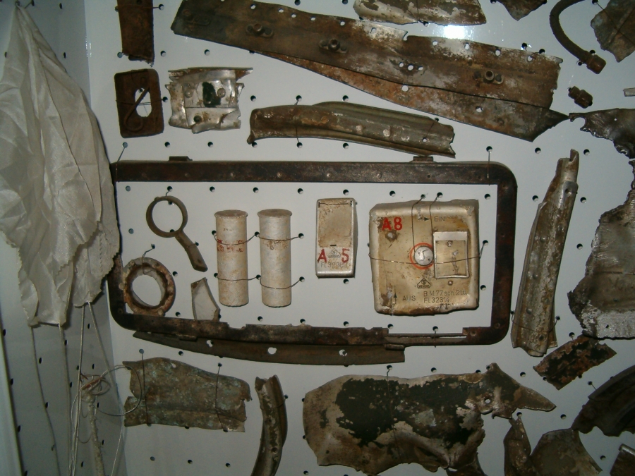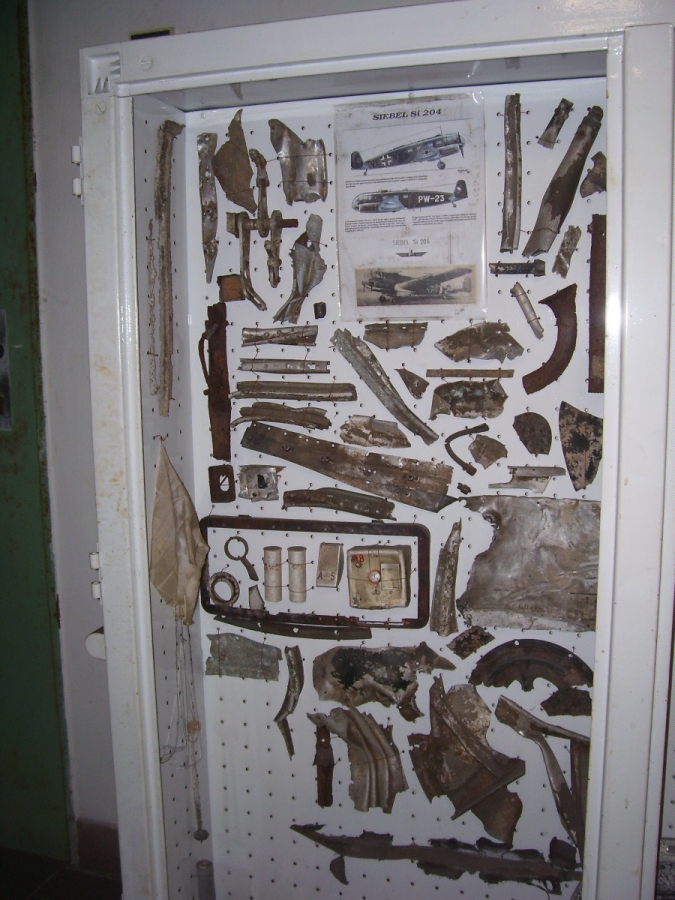 Tak se podařilo najít místo, kde těsně po válce havaroval letoun Siebel Si - 204. Je to nedaleko městečka Třemošnice v Železných horách. Podle pamětníka letoun nouzově přistál a trosky se odvážely na nákladných autech. Ale jak je vidět, něco málo se našlo. Na některých kusech je možné rozeznat zelenou barvu, která byla na povrchu letounu a světle modrou, kterou byl nastříkám vnitřek. Jinak popisky byly všechny v němčině.
