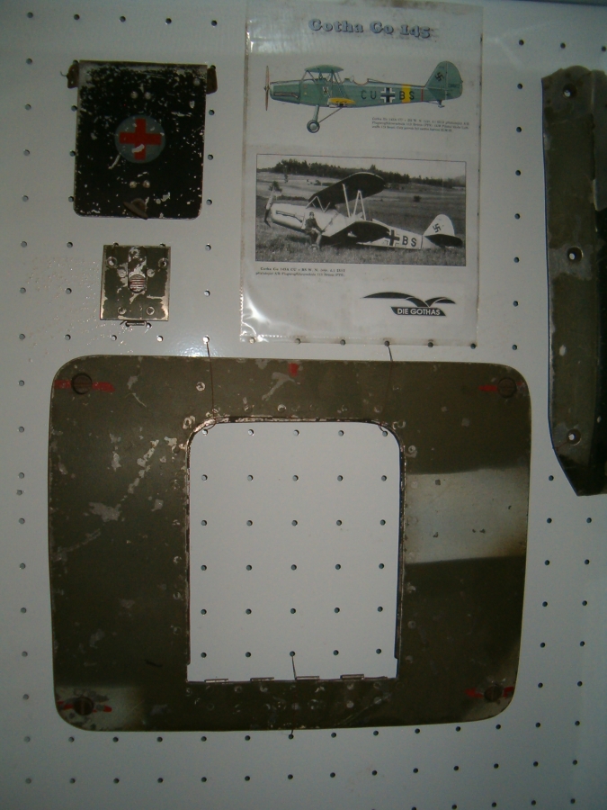 Dostalo se k nám pár věcí z letadla které mělo údajně v květnu 1945 nouzově přistát na poli na Haldě a skončit až v potůčku stejného názvu. Typ jsme dlouho nevěděli, ale získal jsem obrázek štítku, který měl být z letadla sundán a tam je typ Gotha Go 145