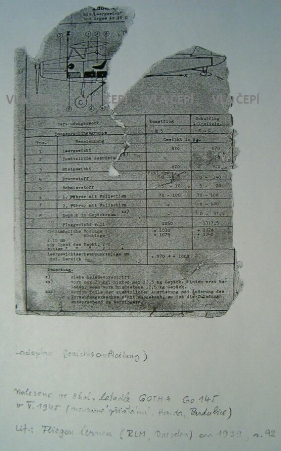 Dostalo se k nám pár věcí z letadla které mělo údajně v květnu 1945 nouzově přistát na poli na Haldě a skončit až v potůčku stejného názvu. Typ jsme dlouho nevěděli, ale získal jsem obrázek štítku, který měl být z letadla sundán a tam je typ Gotha Go 145